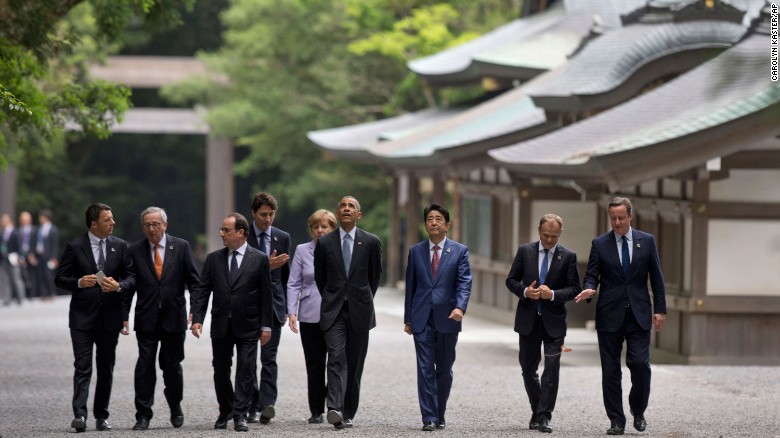 From left: Italian Prime Minister Matteo Renzi, European Commission President Jean-Claude Juncker, French President François Hollande, Canadian Prime Minister Justin Trudeau, German Chancellor Angela Merkel, U.S. President Barack Obama, Japanese Prime Minister Shinzo Abe, European Council President Donald Tusk and British Prime Minister David Cameron walk past the Kagura-den as they visit Ise Jingu shrine in Ise, Japan, on Thursday, May 26. Obama is visiting Japan and Vietnam during his 10th trip to Asia.
